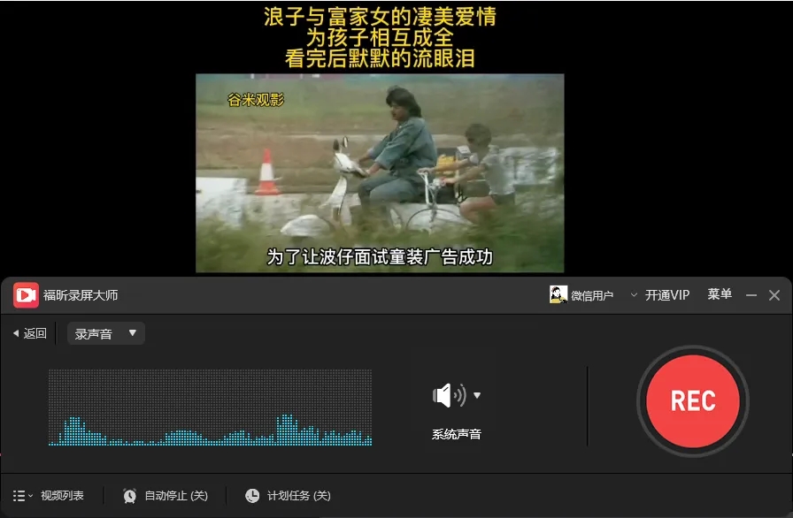 福昕录屏大师可以同步声画录制,也可以单独录制声音,点击【录声音】,可以选录制系统声音或者麦克风声音。我们可以录制电影经典片段语音,或者麦克风录制下你想说的话哦~