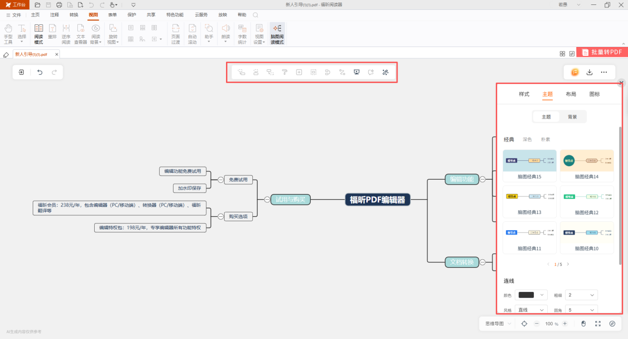 无需跳出应用程序,直接在阅读器内对生成的脑图进行编辑。您可以添加/删除/移动节点,编辑内容,演示播放脑图,更改脑图样式。