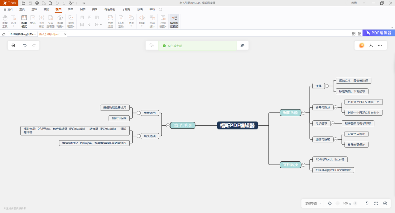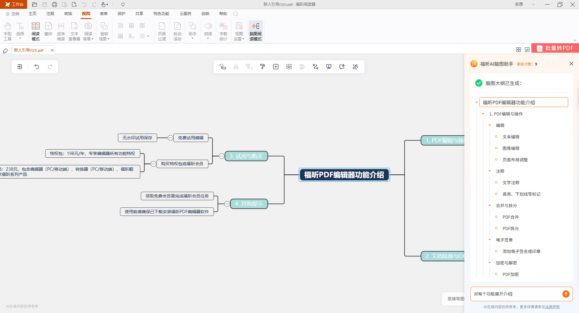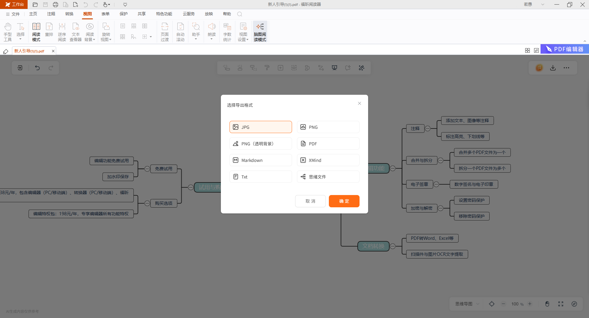 支持将Word/PPT/Excel/PDF转成脑图进行阅读。文档拖入到软件工作界面后,自动转成PDF,点击【视图】-【脑图阅读模式】,即可呈现一份提炼过框架的思维脑图。点击【阅读模式】即可回到PDF阅读。