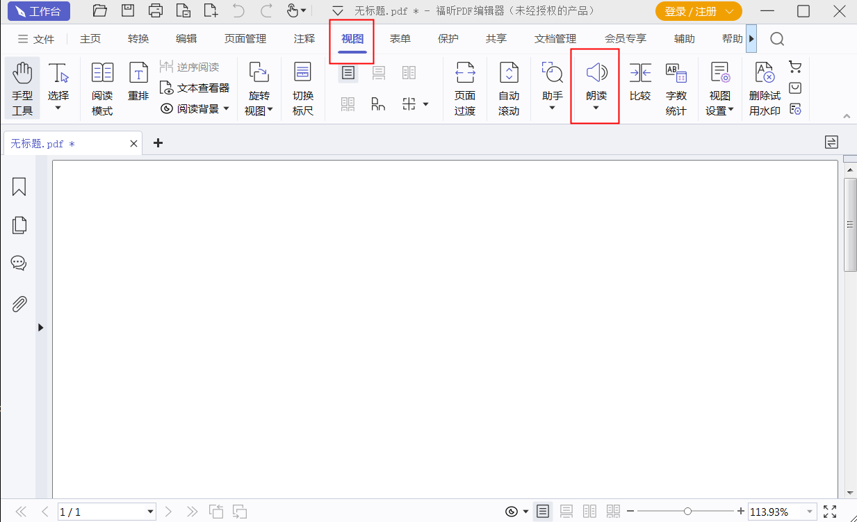 我们完成PDF文档的导入后,在PDF编辑器的页面顶部找到【视图】栏,点击之后再找到【朗读】选项并单击这个选项。