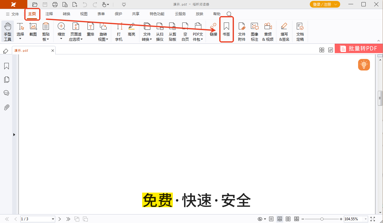 各位小伙伴在PDF文档导入后,点击页面顶部【主页】栏,找到【书签】并单击。