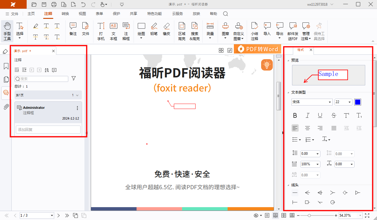 我们可以新增PDF注释,也可以选择在PDF文件中已存在的注释,然后在进行字体样式修改。