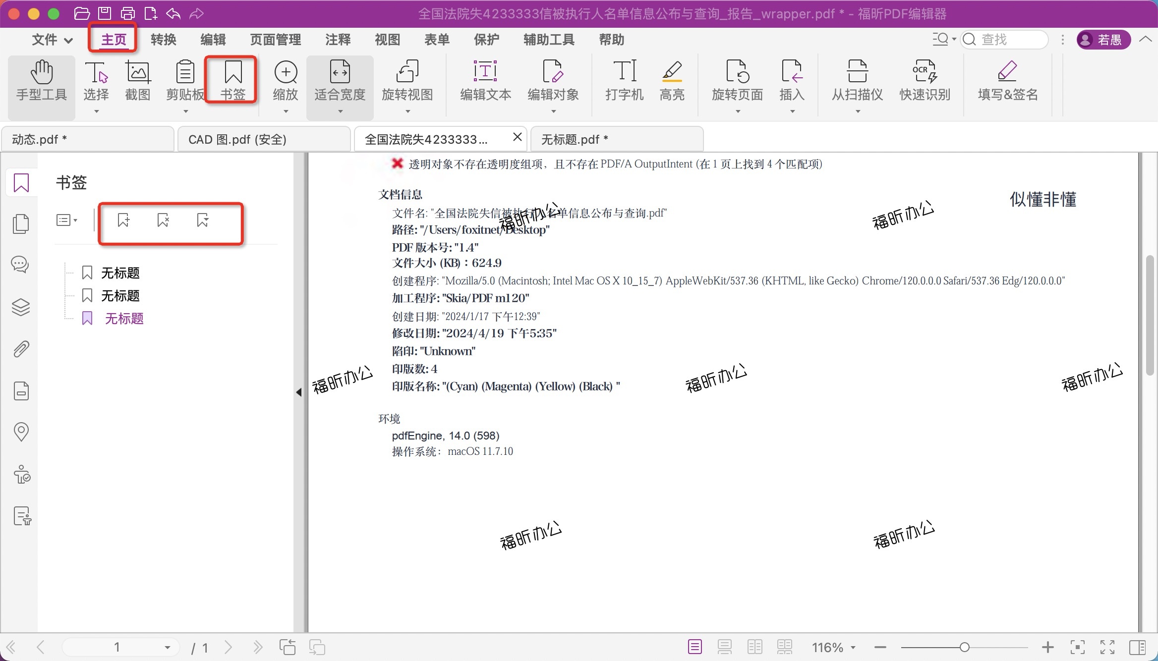 各位小伙伴在PDF文档导入后,点击页面顶部【主页】栏,找到【书签】并单击。