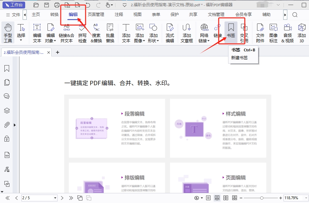 福昕PDF编辑器是福昕旗下最具代表性的PDF编辑工具。我们常见的PD文件操作都可以通过福昕PDF编辑器实现,主要包括PDF文件编辑、PDF文件合并拆分、PDF格式转换、PDF增删水印以及其他一些操作。下面主要展示PD添加书签的方法。
