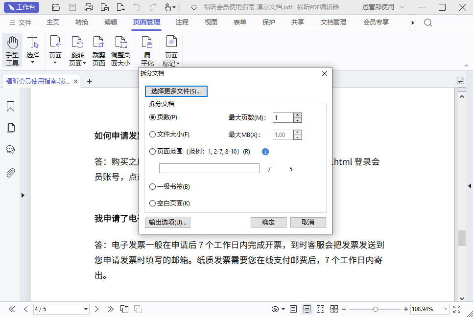 在新跳出的弹窗里,可以选择按最大页数拆、最大文件拆、也可以自定义拆解页面范围、以及拆分处理的形式等等不同的方式。