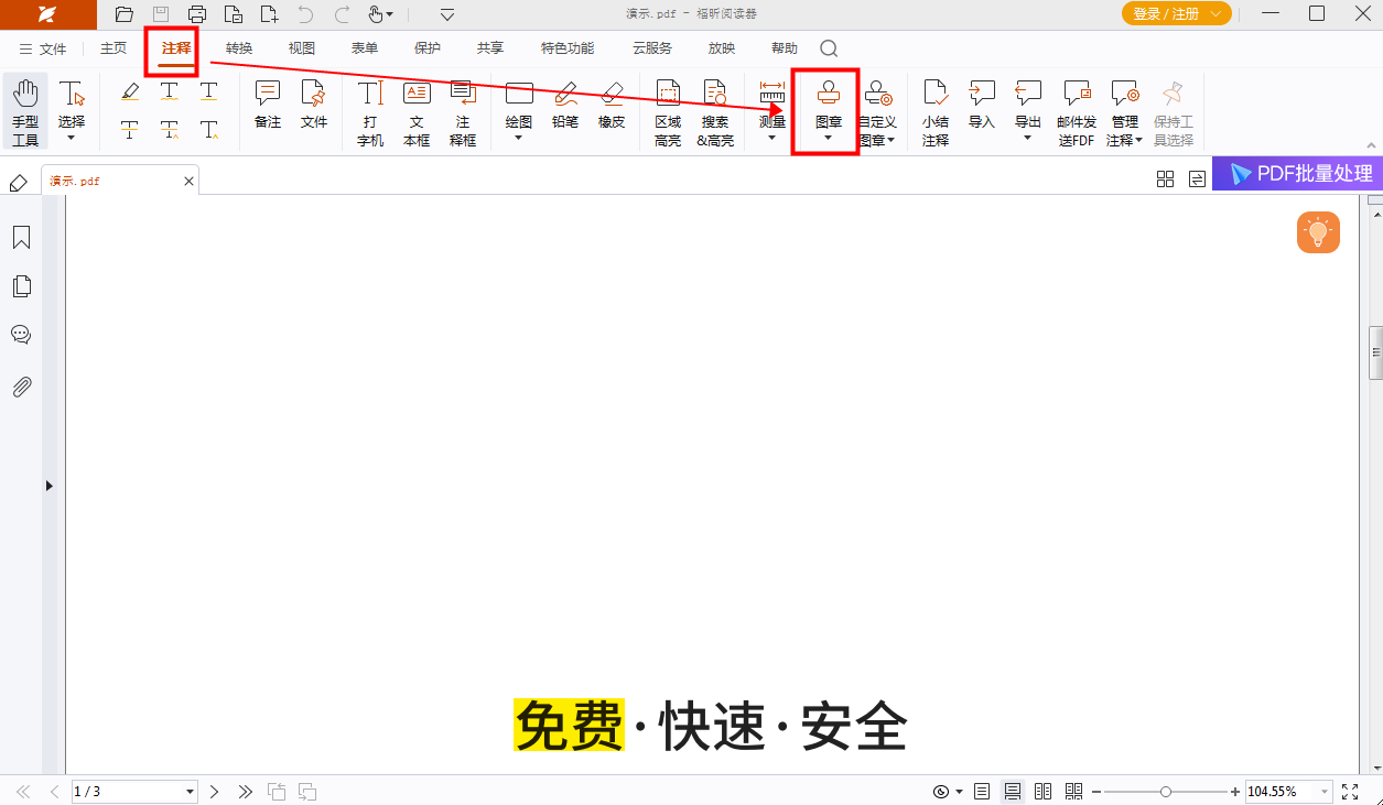 各位小伙伴在PDF文档导入后,点击页面顶部【注释】栏,找到【图章】并单击,就可以开始添加图章啦。