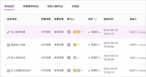 - 包括"我发起的""待我操作的""待他人操作的""已完成"等四个模块