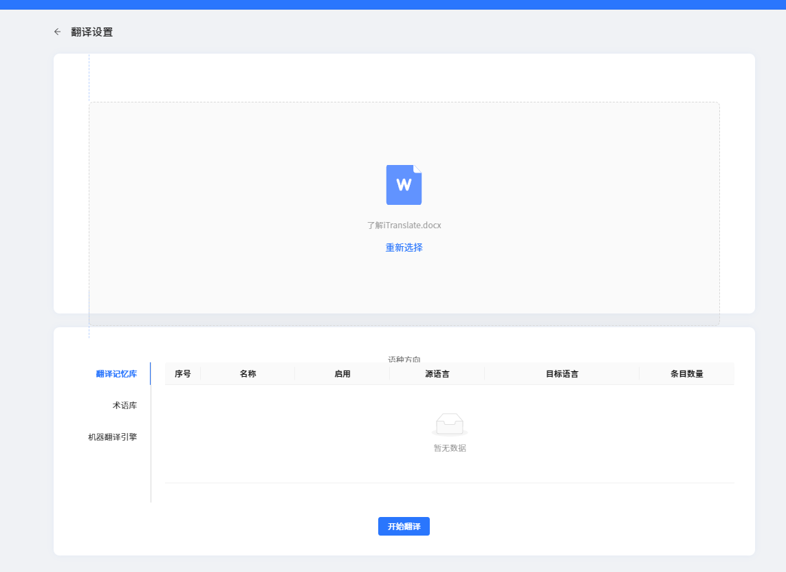 第三步,勾选源语言和目标语言。点击【开始翻译】,等待翻译任务完成即可查看译文。