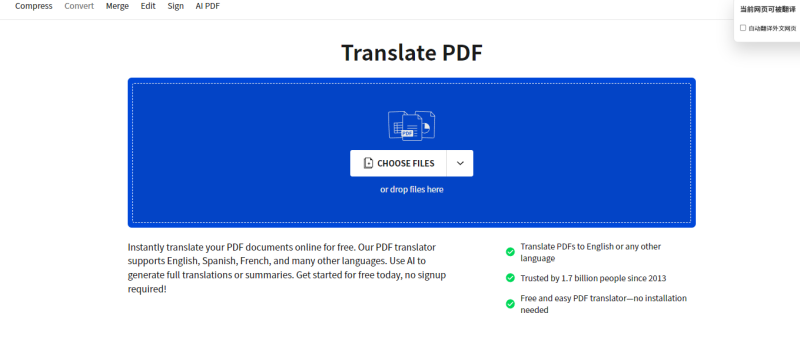 不仅能翻译PDF,还能处理PDF的其他操作,功能很实用。免费版能翻译日常的英语PDF,译文清晰易懂,而且格式丢失得少,表格和图片基本能留在原位。网页界面干净没广告,不用注册,点进去就能用,适合偶尔需要翻译PDF的小伙伴,免费又方便。