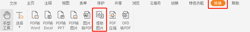 方法一:在新版本打开PDF文档后,可点击工具栏【转换】 — 选择【提取图片】即可