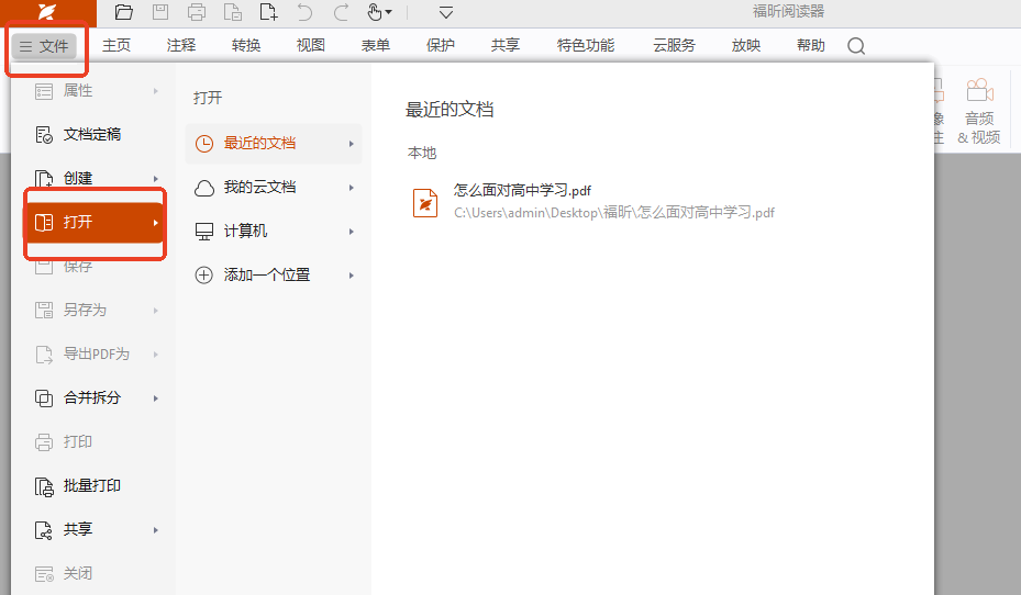 步骤一:在PDF阅读器中点击上方的【菜单栏】中的【打开】选项点击打开需要转换的PDF文件。