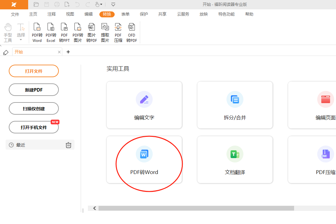 步骤一:打开下载好的PDF阅读器专业版,进入后首页就有PDF转word功能点击进入即可。