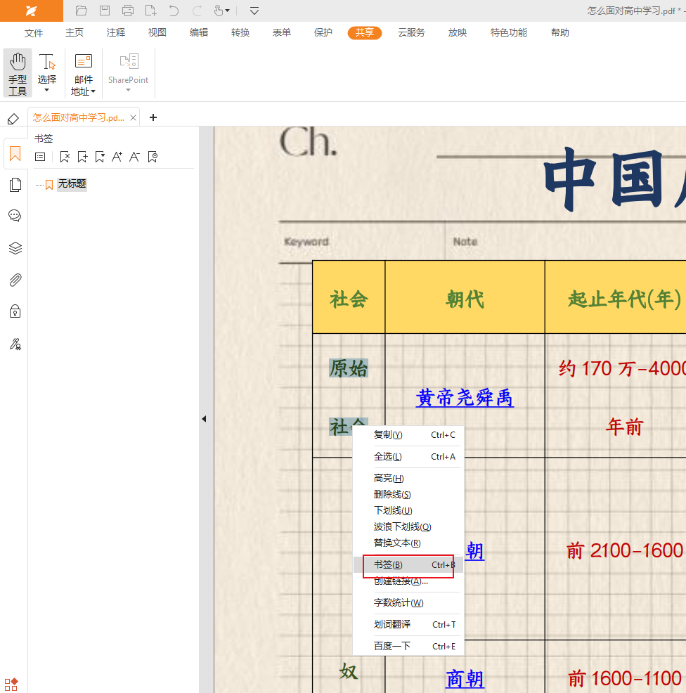 步骤二:点击左侧【书签】工具栏,在文档中选中想要添加书签的文本,点击【书签】按钮,即可将其设置为书签。