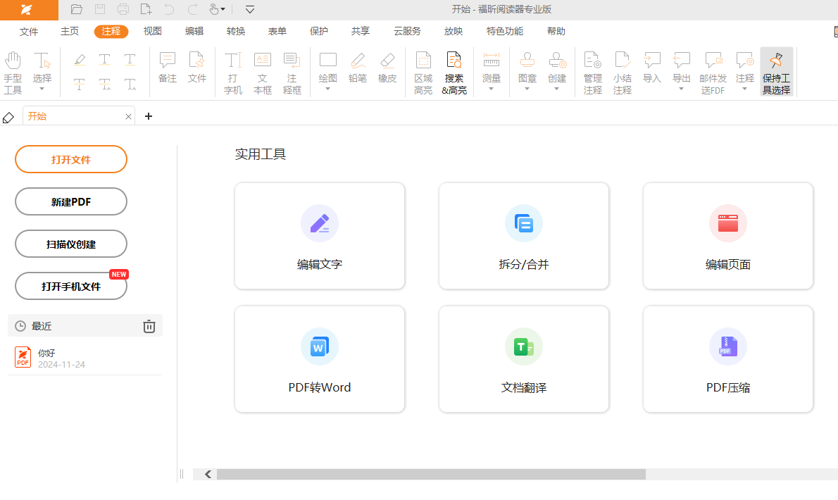 步骤一:在福昕官网下载安装福昕阅读器专业版。双击打开,点击打开文件,选择需要处理的PDF文件。