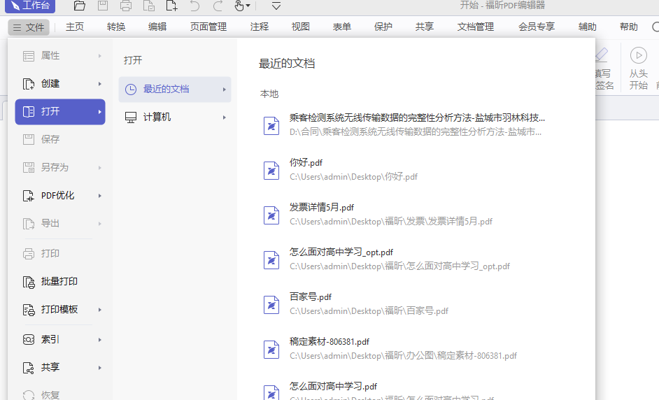 步骤一:在福昕官网下载安装福昕阅读器专业版。双击打开,点击打开文件,选择需要处理的PDF文件。