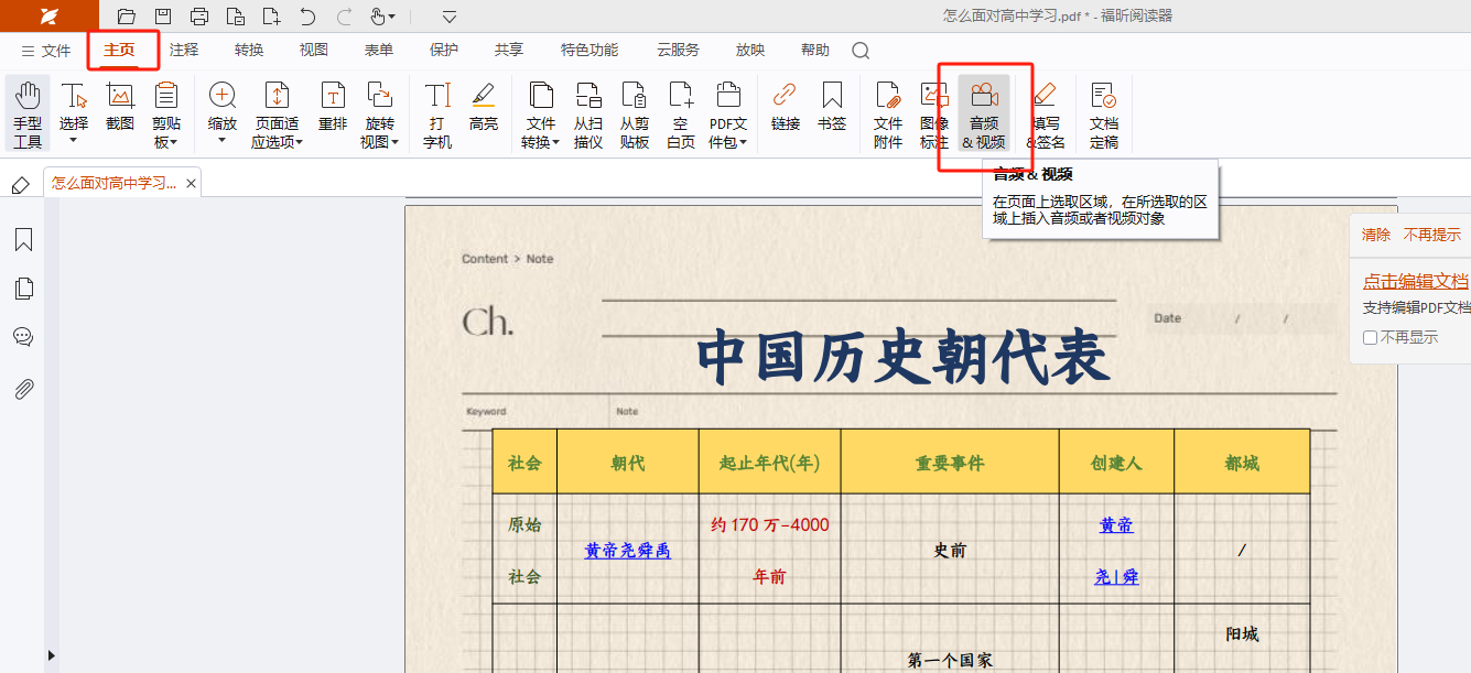 步骤二:等PDF文档成功导入后,在软件页面的顶部找到编辑栏,点一下这个编辑栏,接着就能看到音频&视频选项啦,再单击这个选项。