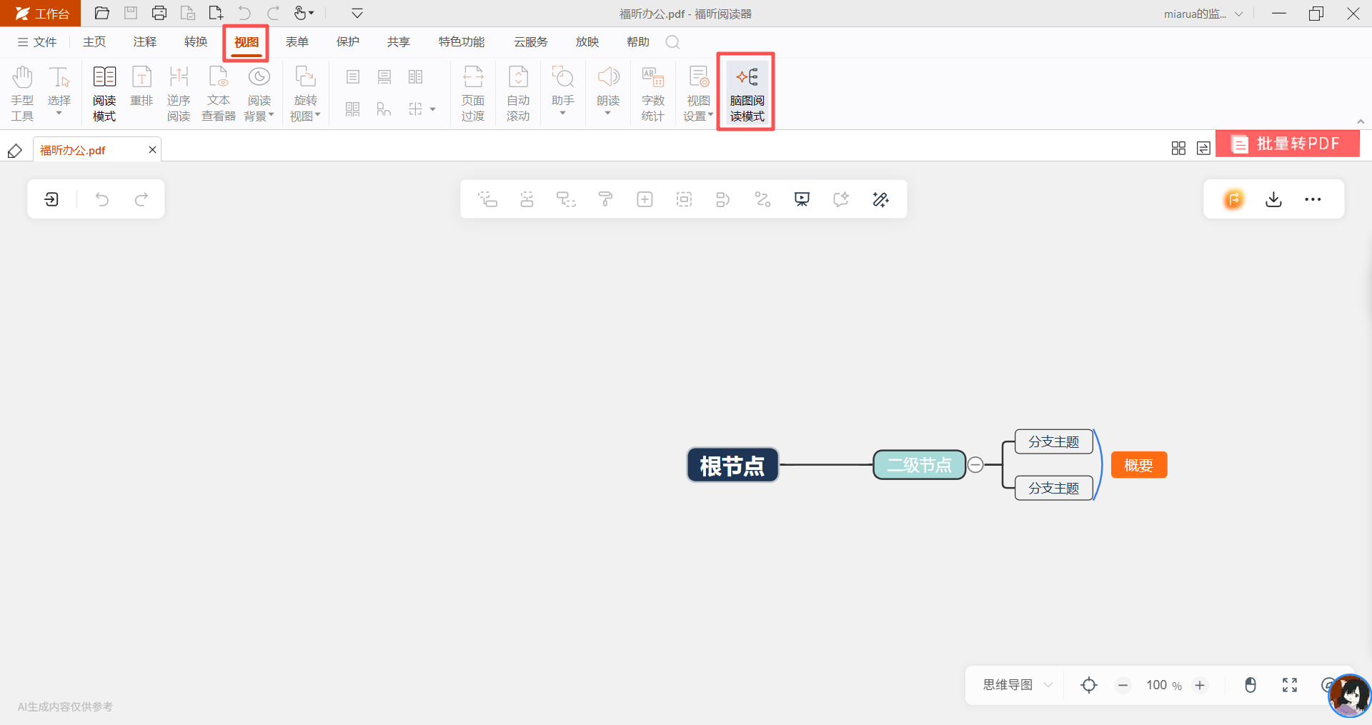 福昕PDF阅读器大家都熟吧?本来就是咱们平时处理PDF都爱用的老牌工具,靠谱又顺手。它后加的这个脑图功能是真的戳中刚需,尤其那个“PDF转脑图+多格式导出”的一体化体验,对天天跟PDF打交道的打工人、学生党来说简直是福音!你想啊,不用先在福昕里把PDF转成脑图,再费劲保存到桌面,又打开别的工具重新导入脑图才能导出,全程就在福昕一个软件里操作,转完脑图直接就能导出成各种格式,省了来回切换软件的功夫,效率直接提上来了。