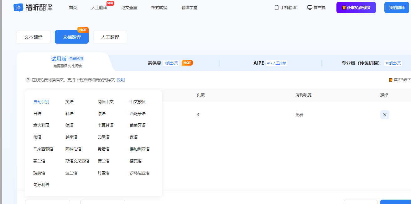 步骤三:文件上传完成后,点击到试用版,可以免费进行翻译。最后选择相应的语种就可以轻松完成文件的翻译啦、