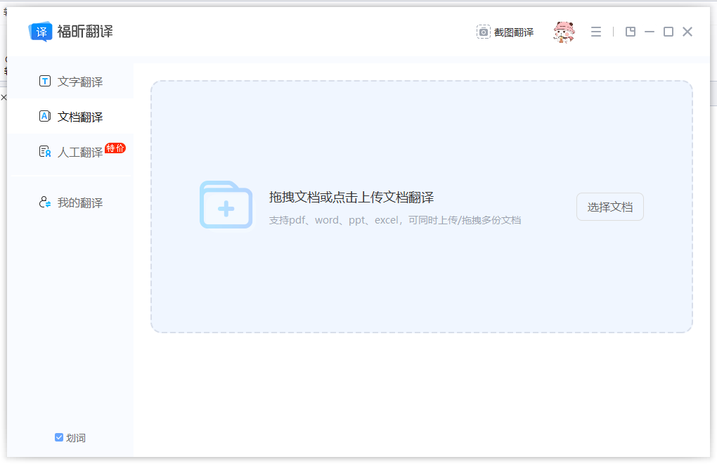 步骤二:点完【文字翻译】之后,会出现下面这个页面。然后咱们只需要上传PDF文档,翻译就搞定了。