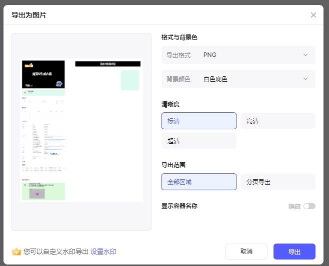 第三步:优化+导出/分享:生成脑图后,能直接拖拽调整节点位置、修改颜色和样式;如果需要补充其他元素,直接在左侧工具栏添加即可。满意后点击右上角「导出」,选PDF、PNG等格式下载,也能生成分享链接发给他人