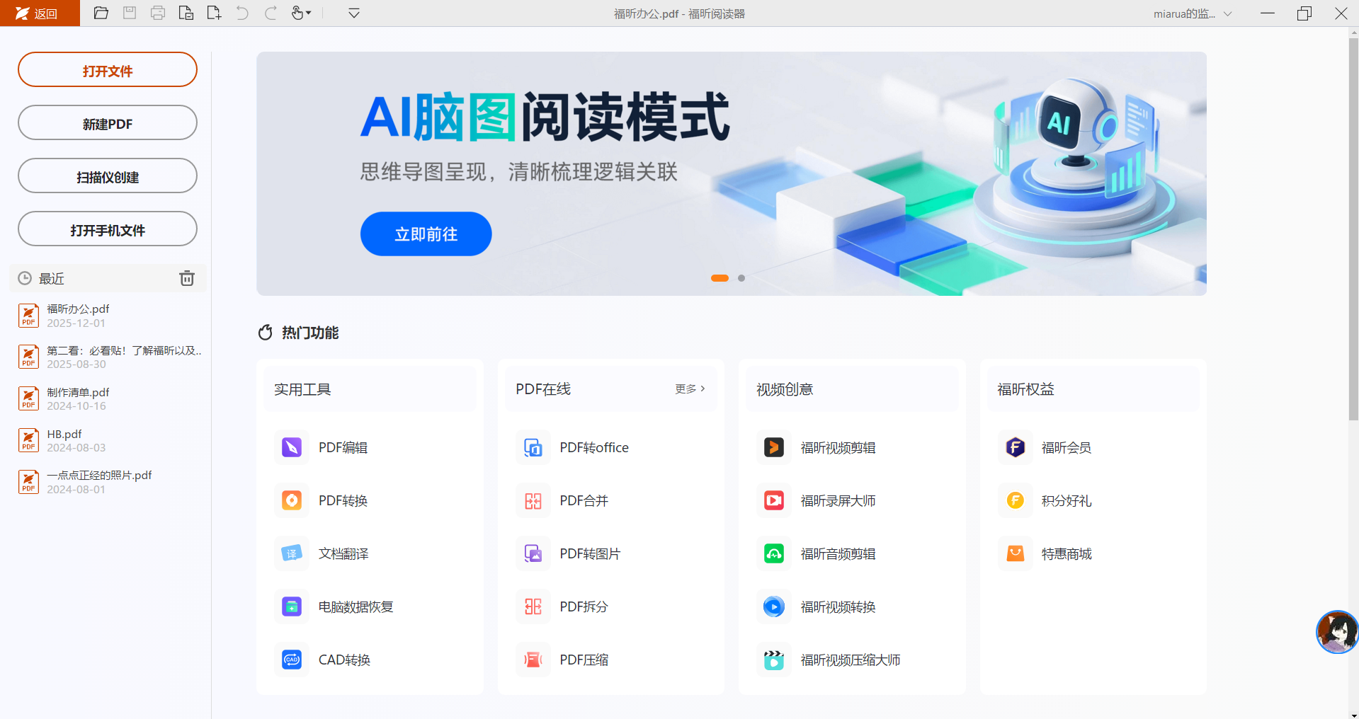 一、打开文件 在福昕官网下载最新版本的福昕PDF阅读器,随后双击打开软件后导入需要处理的PDF文档或者是脑图。