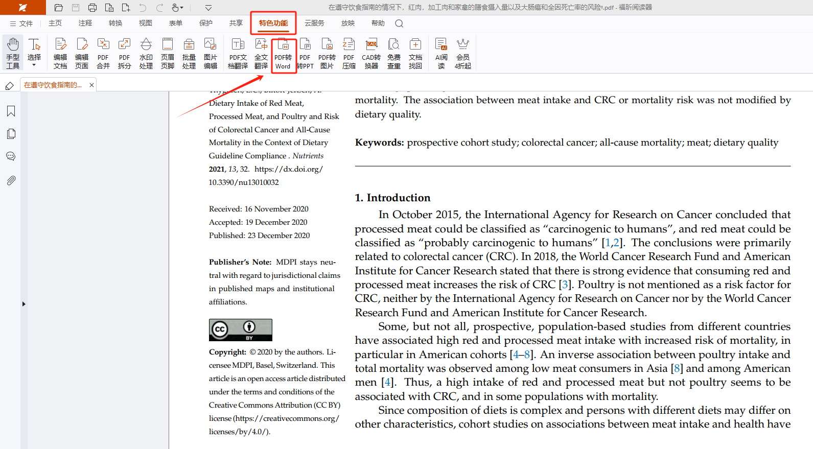 PDF打开后,点击软件界面顶部的【特色功能】,在里面找到PDF转Word。