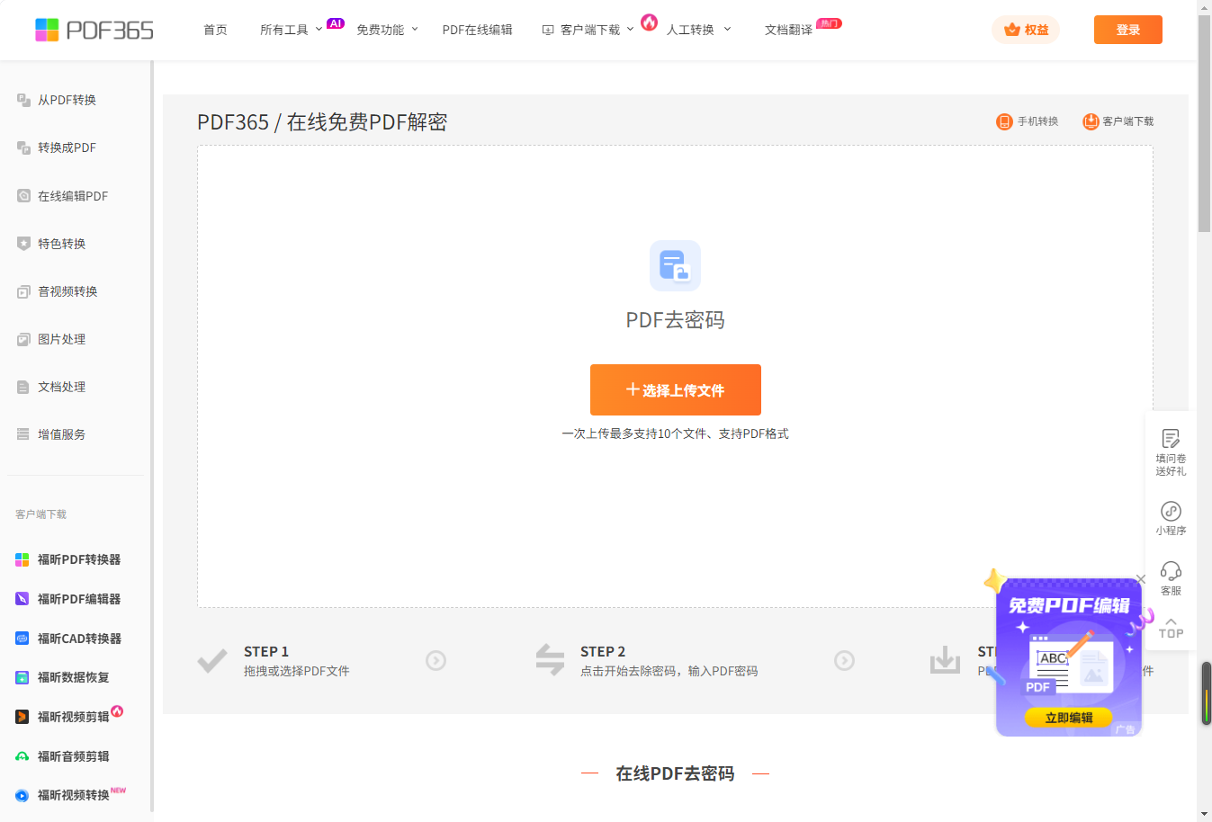 第一步:先打开福昕PDF365官网,在导航栏找到“PDF去密码”功能点进去;