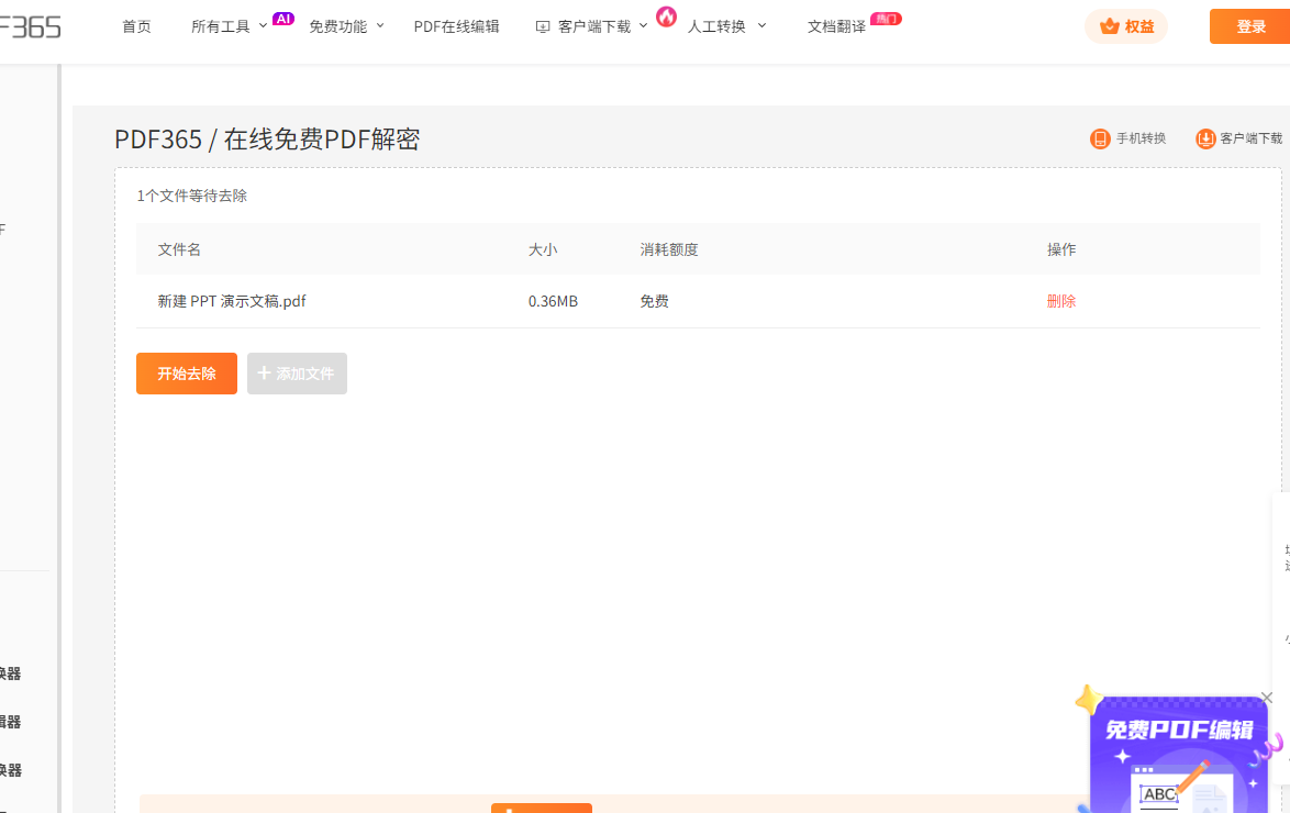 PDF文件有密码打不开,没有办法编辑,我们可以使用用福昕PDF365在线去PDF密码简直太方便啦!不用下载软件,打开网页就能用。它去密码速度快得很,几秒钟就搞定,不管是PDF文件去除密码,还是加密码都可以轻松搞定,还可以转换各种文件格式,最重要的是完全免费,没有隐藏收费,普通用户日常用足够了,操作还特别简单,小白也能一看就会。