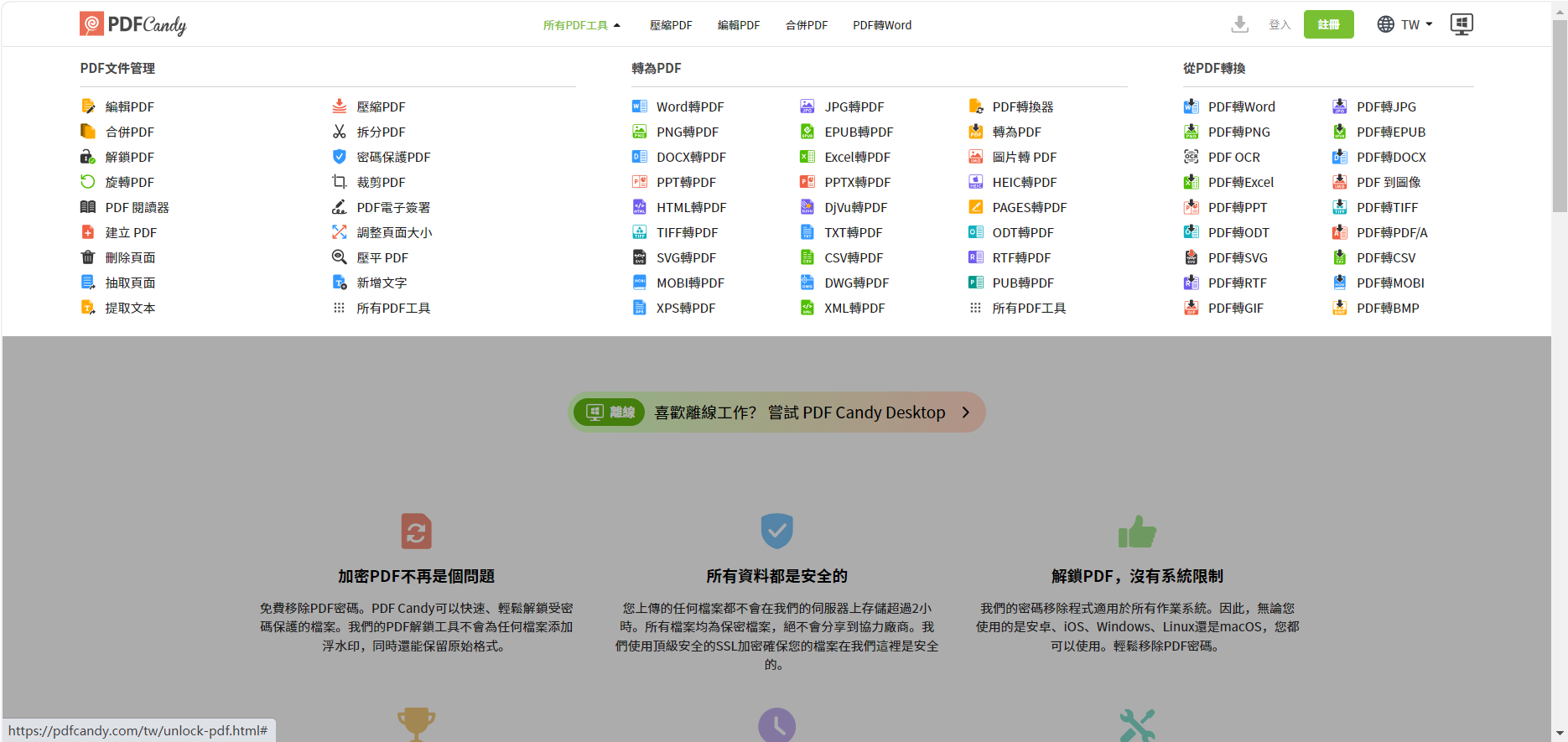 第一步:打开浏览器,在地址栏输入PDF Candy的网址,进入其官网,找到免费的PDF密码去除工具页面。