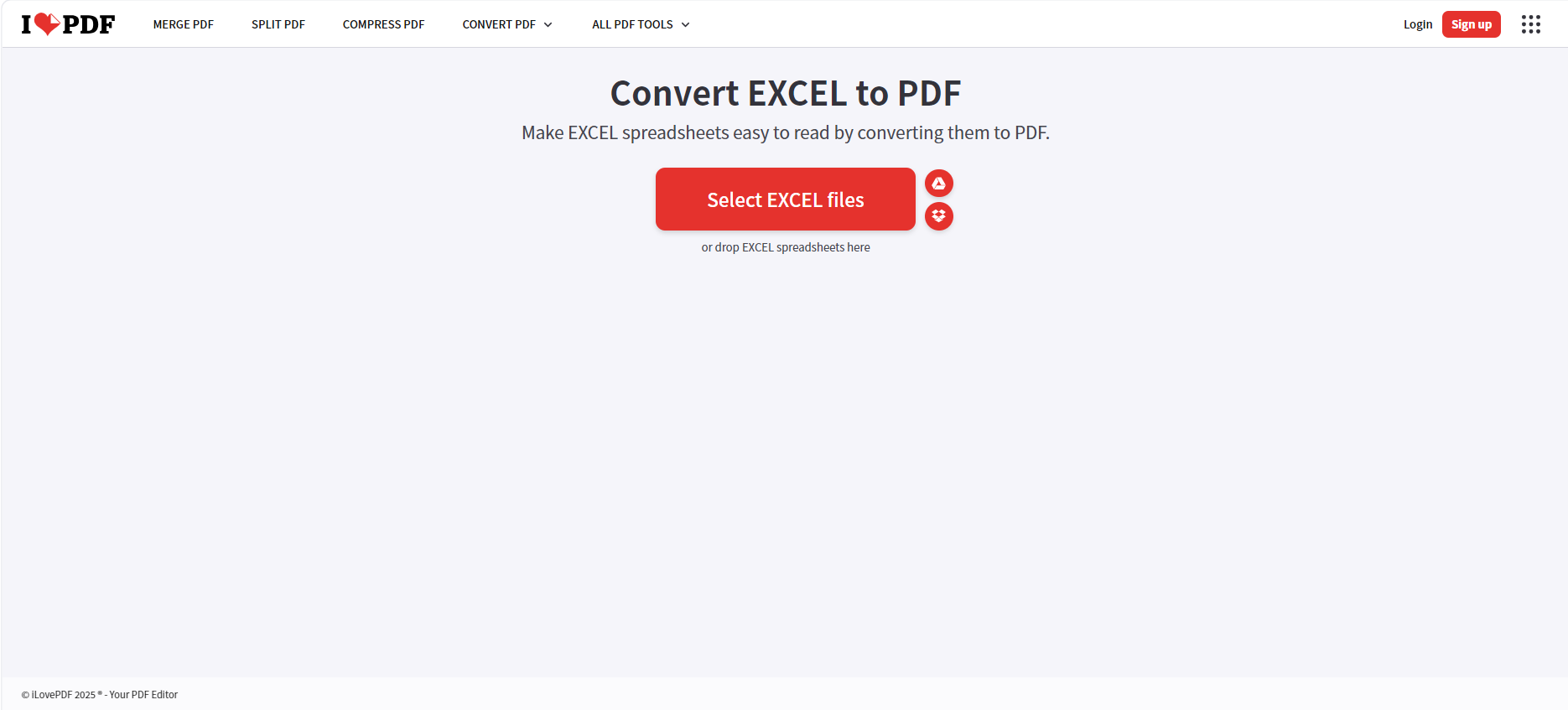 第一步:访问iLovePDF官网,点击“Excel to PDF”功能,点击“选择文件”上传Excel表格。