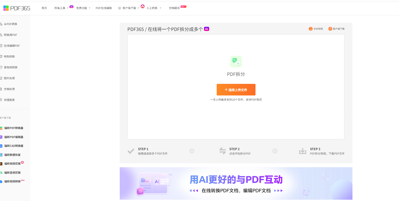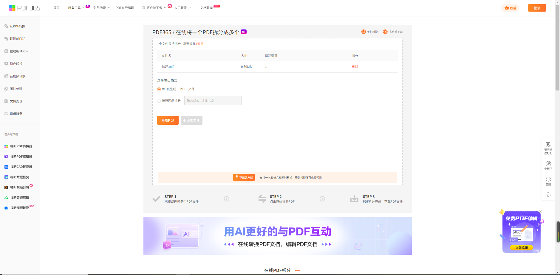 用福昕PDF365在线拆分PDF太方便啦!不用下载软件,打开网页就能用,手机电脑都能操作,省得占内存。拆分速度特别快,不管多大的PDF文件,几秒钟就搞定,而且拆分后的文件清晰度一点都不变,还能批量处理多个文件,最重要的是安全有保障,文件处理完自动删除,可以免费享受到基础拆分功能,性价比超高!不仅支持拆分PDF文档,还可以将各种文件格式相互转换,功能超全!