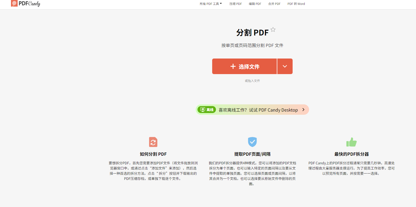 第二步:点击“选择文件”上传需要拆分的PDF,也能直接拖拽文件到网页;