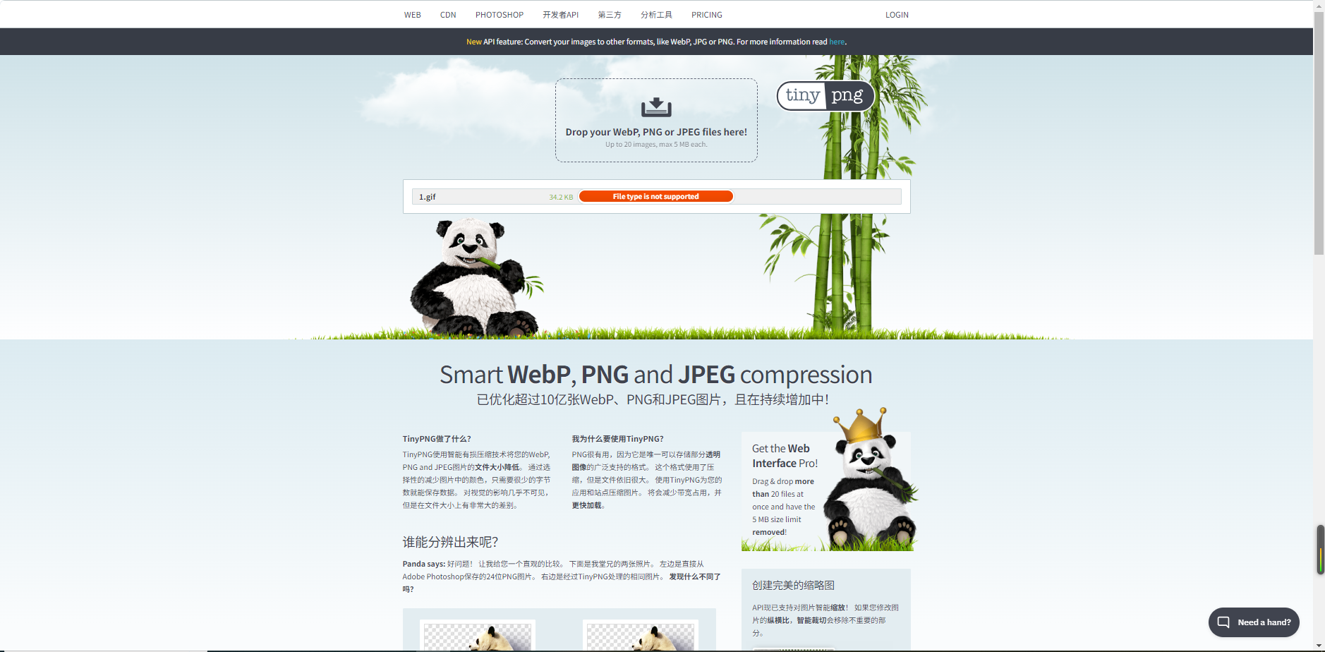 第一步:进入TinyPNG官网,将需要压缩的图片拖放到指定区域或点击按钮选择文件上传。