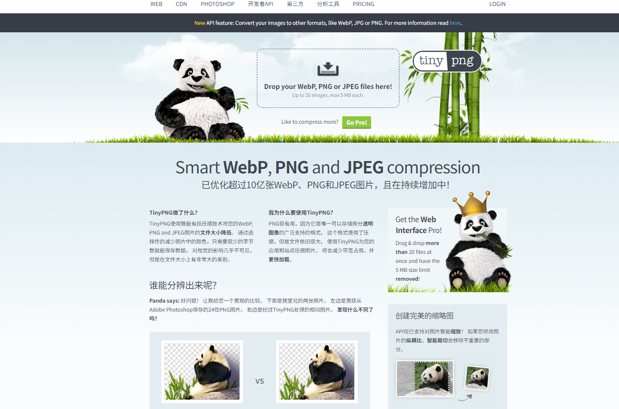 这是一个非常受欢迎的在线压缩工具,专注于PNG和JPEG格式的无损压缩。它采用先进的压缩算法,能够在不损失图片质量的前提下,大幅减小图片文件的大小。用户可以直接拖放多个文件进行批量压缩,压缩后还可以一次性下载所有压缩好的图片,操作简单且高效,特别适合需要处理大量图片的用户。