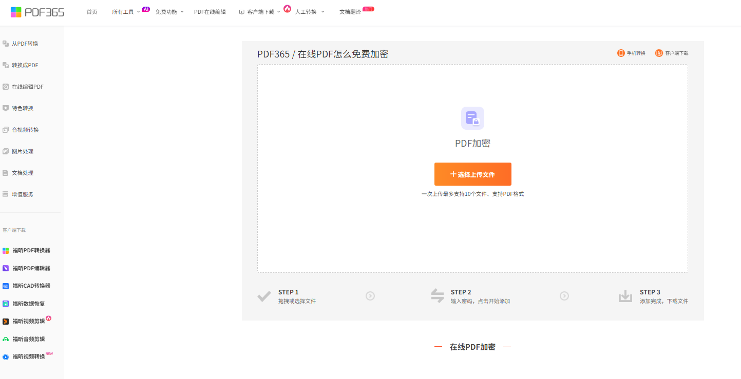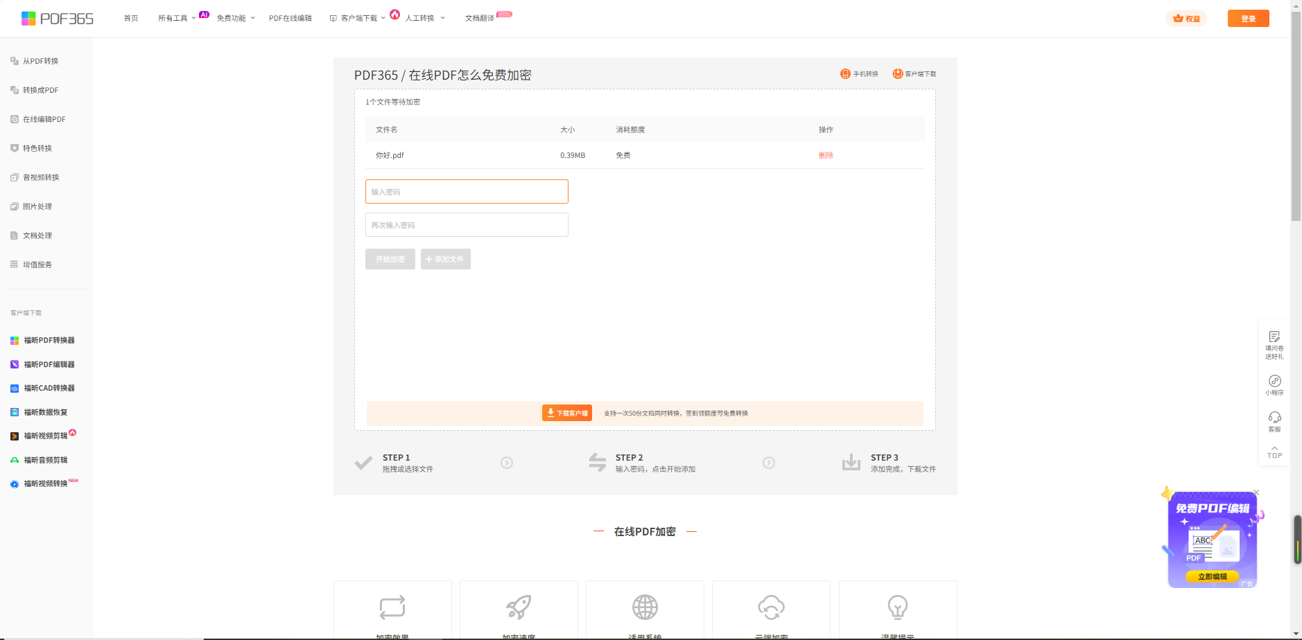 第一步:在浏览器中搜索关键词福昕PDF365找到官网并进入,点击上方的所有功能,找到并点击PDF加密功能选项。