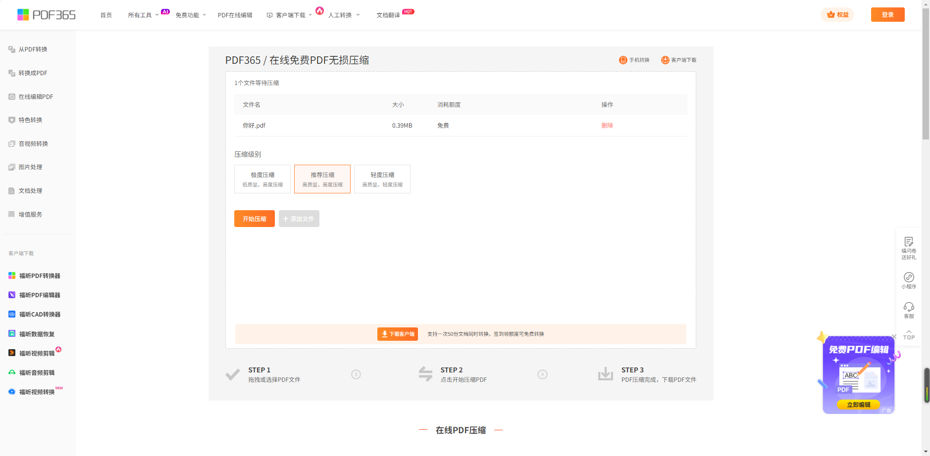 用福昕PDF365在线压缩PDF太方便啦!不用下载软件,打开网页就能用,手机电脑都能操作。压缩效果超棒,文件能变小70%还不模糊,发邮件、传文件嗖嗖快。它还能转格式、合并拆分PDF,功能全还免费,隐私保护也到位,文件处理完自动删除,放心用!比那些要装插件、收费的好用多了,办公党必备神器!
