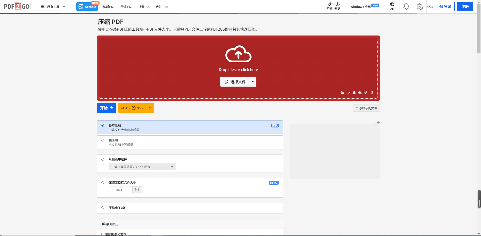 第一步:进入PDF2Go官网“压缩PDF”功能区,点击“选择文件”上传PDF或输入文件链接。
