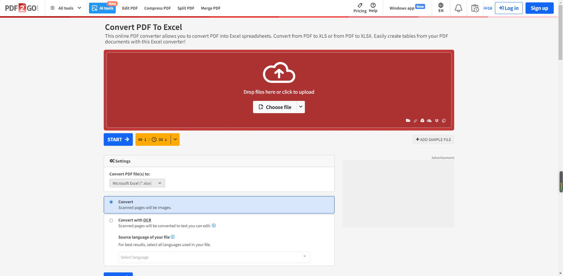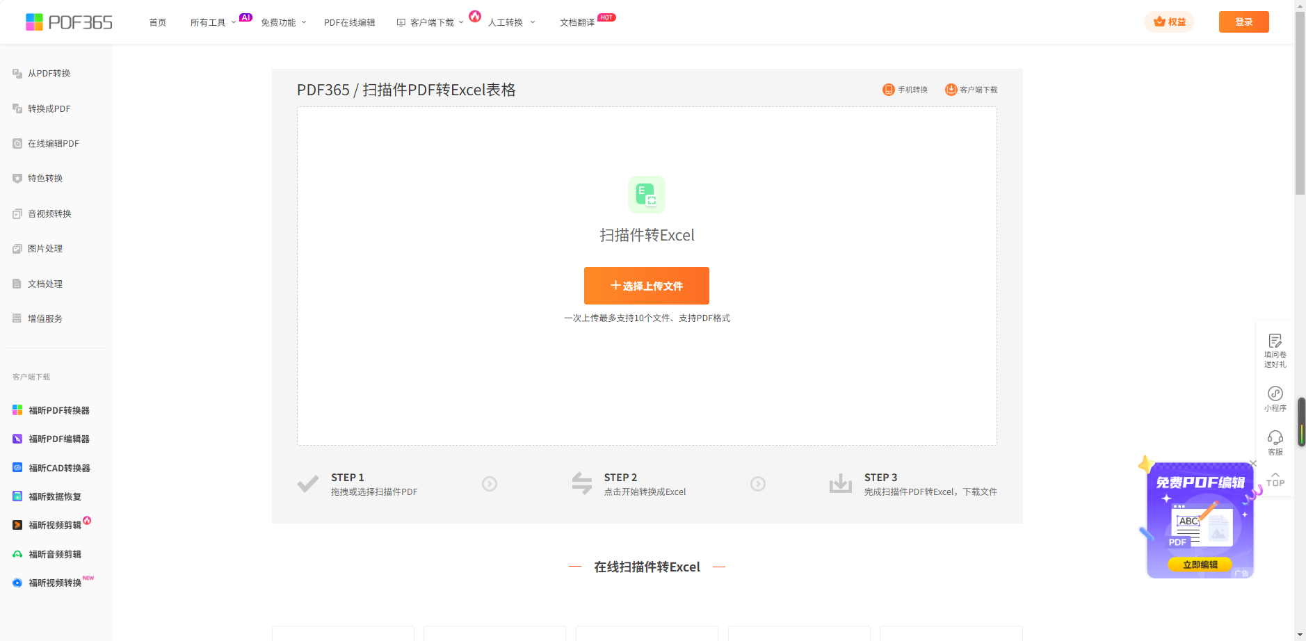 第一步:进入网站转换区域,上传扫描件PDF,选输出格式为Excel。