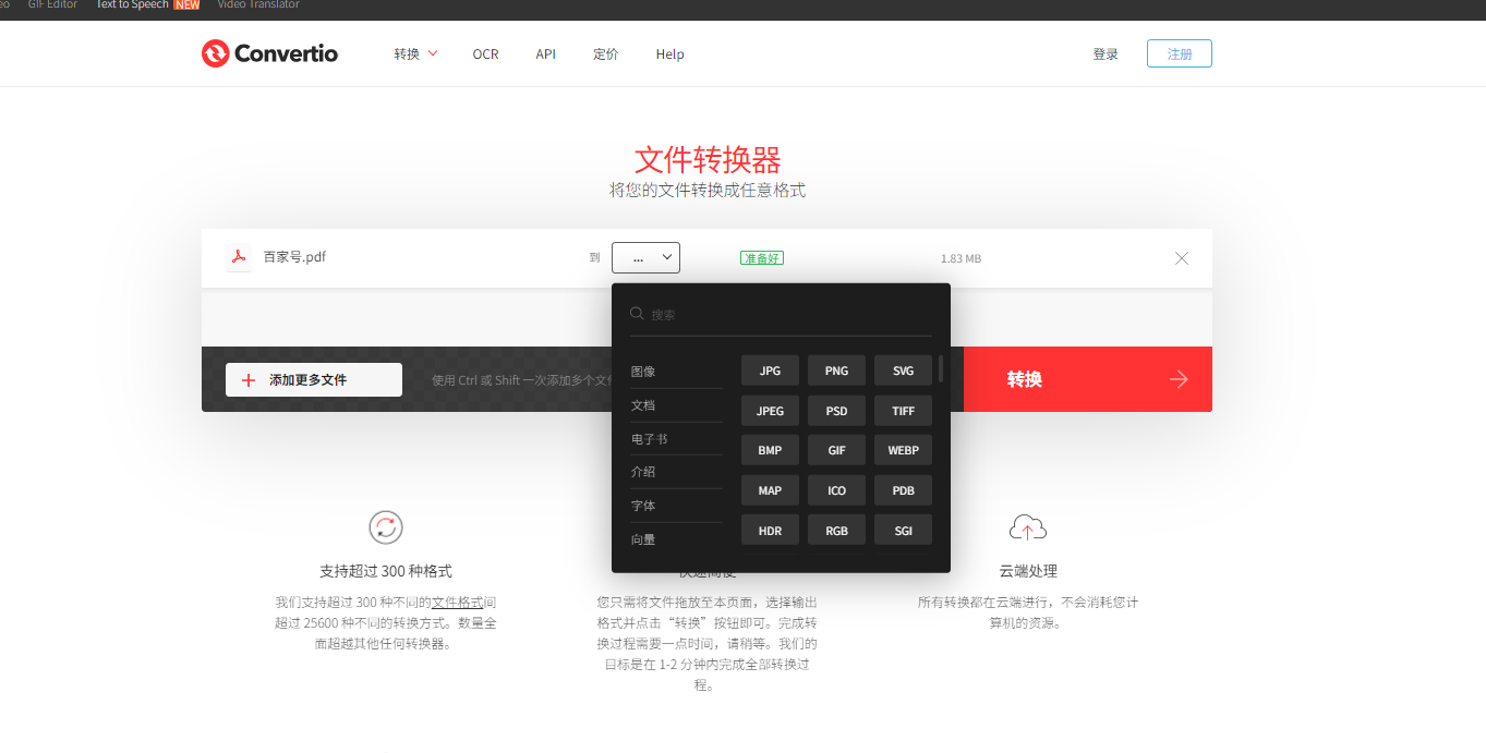 第二步:在输出格式中选择“PDF”,确认转换设置后点击“转换”,等待处理完成后下载生成的PDF文件即可。