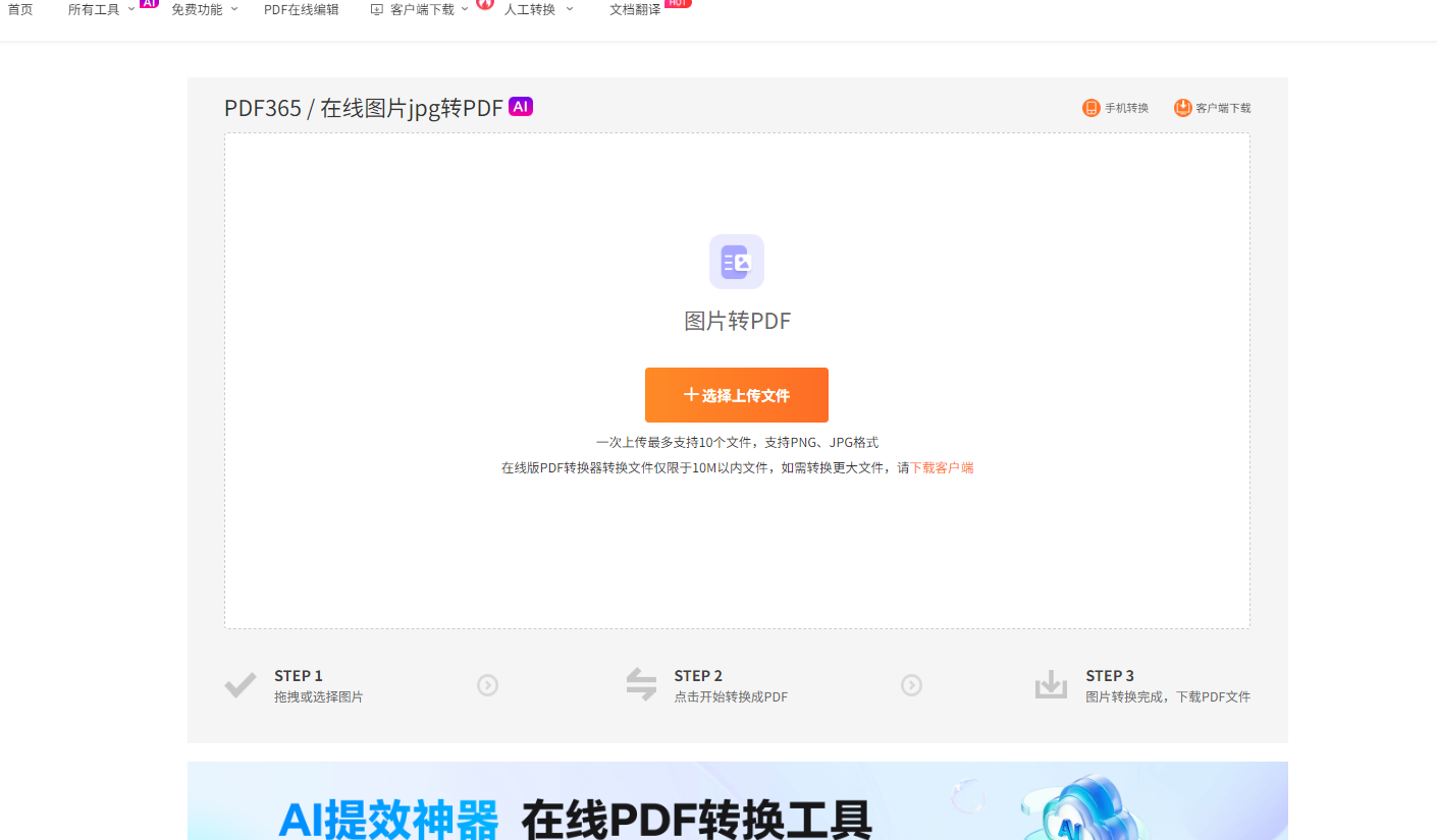 第一步:打开福昕PDF365官方链接,进入官网或下载客户端,找到“图片转PDF”功能模块,点击“添加文件”上传需要转换的图片;