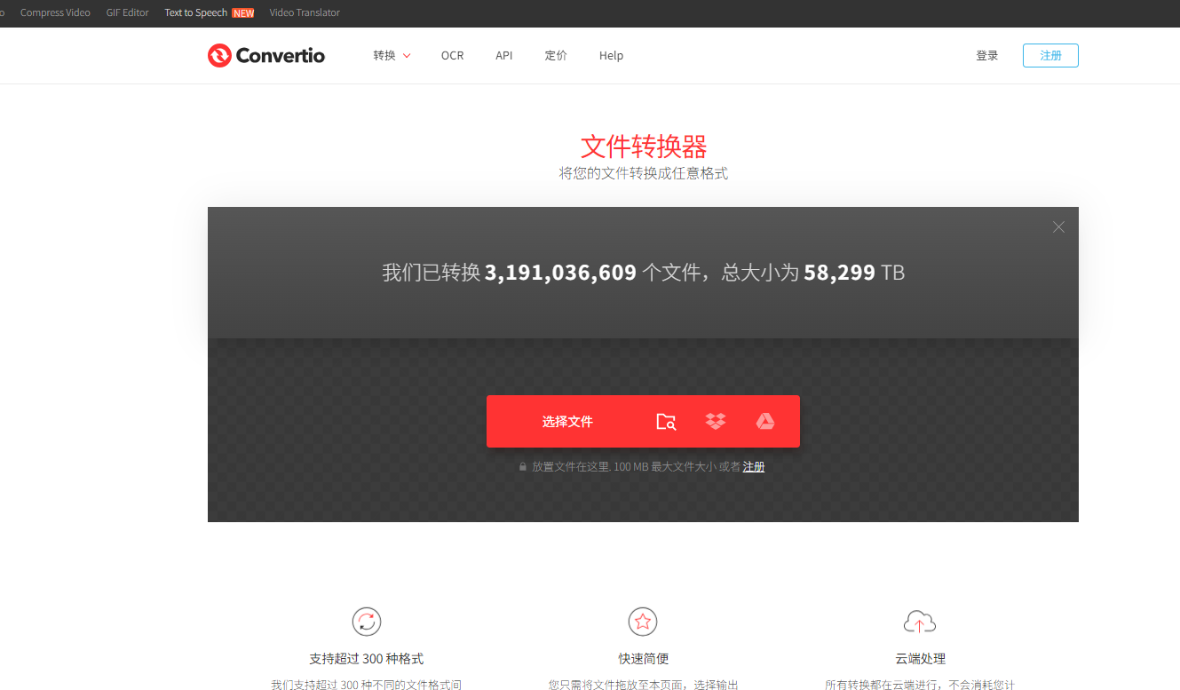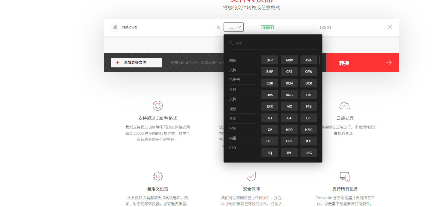 第一步:访问Convertio官方,找到“CAD to PDF”功能,点击“选择文件”上传需要转换的CAD图纸;