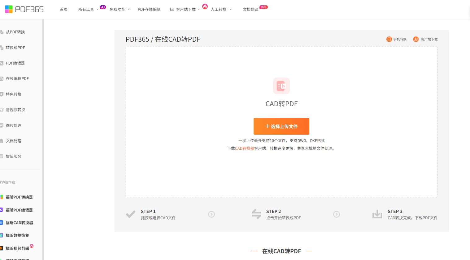 第一步:打开福昕PDF365客户端或官网,进“文档转换”模块,选“CAD转PDF”功能,上传CAD文件;
