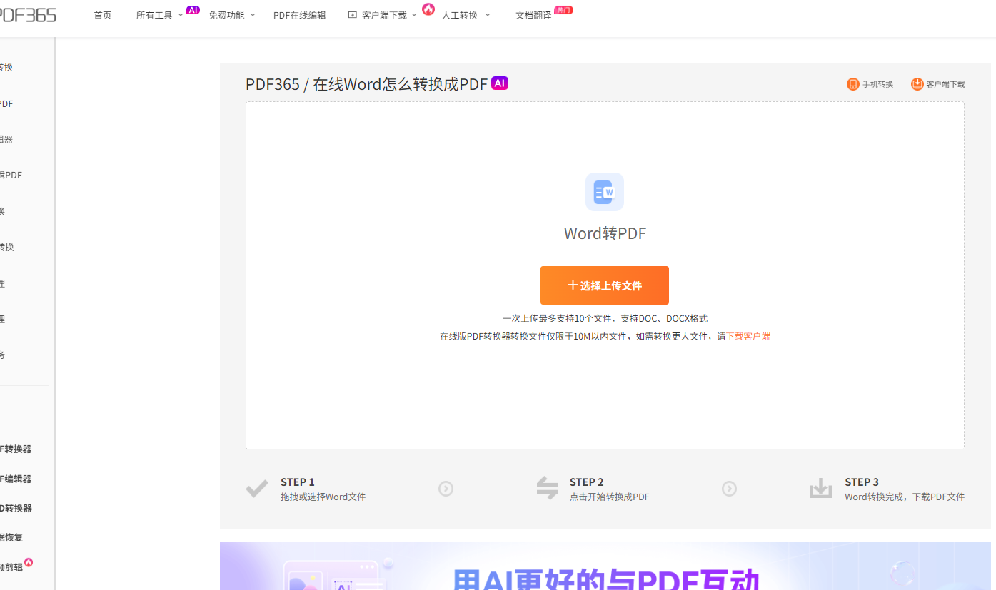 第一步:打开福昕PDF365官网或电脑版软件,找到“Word转PDF”这个功能,点“添加文件”把要转的Word传上去;