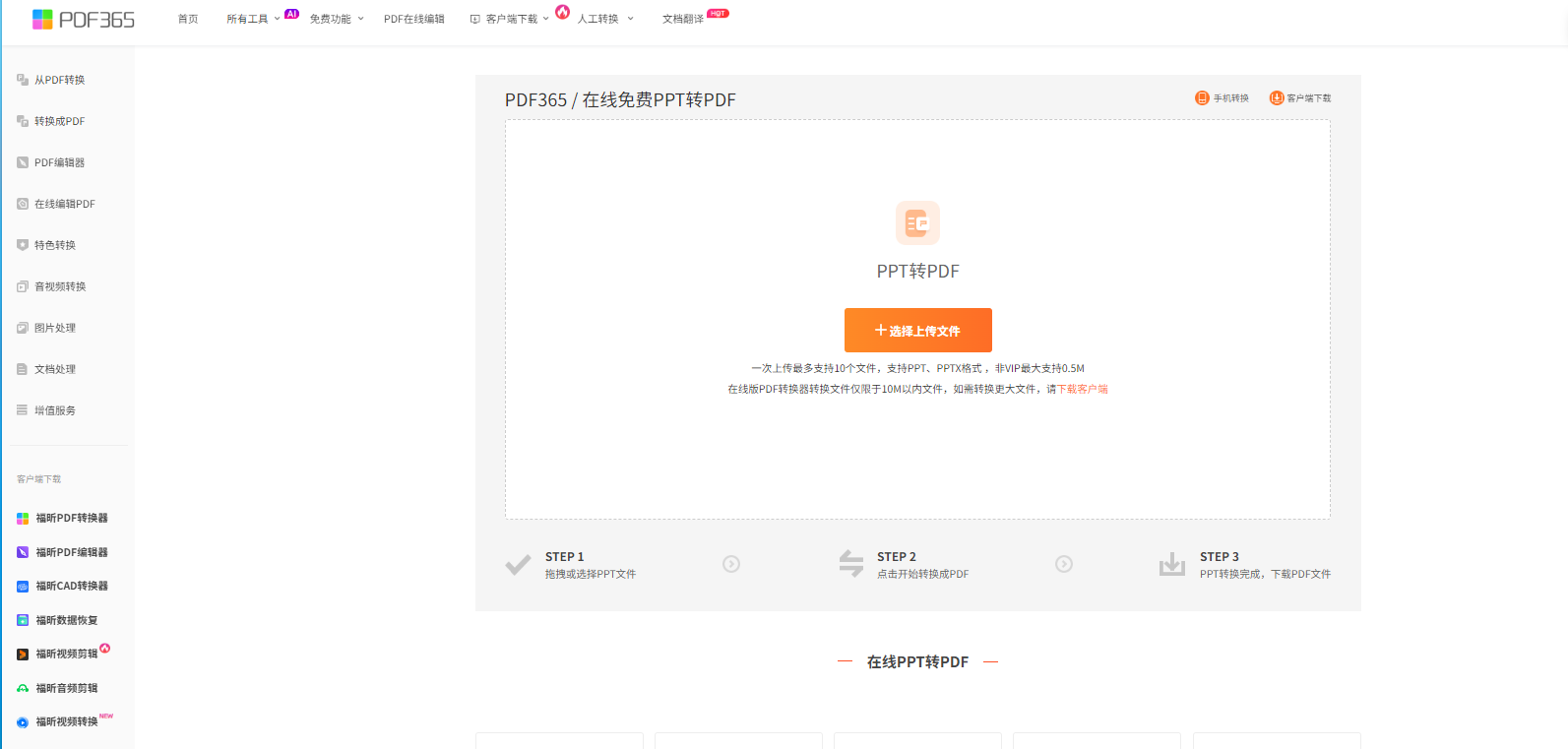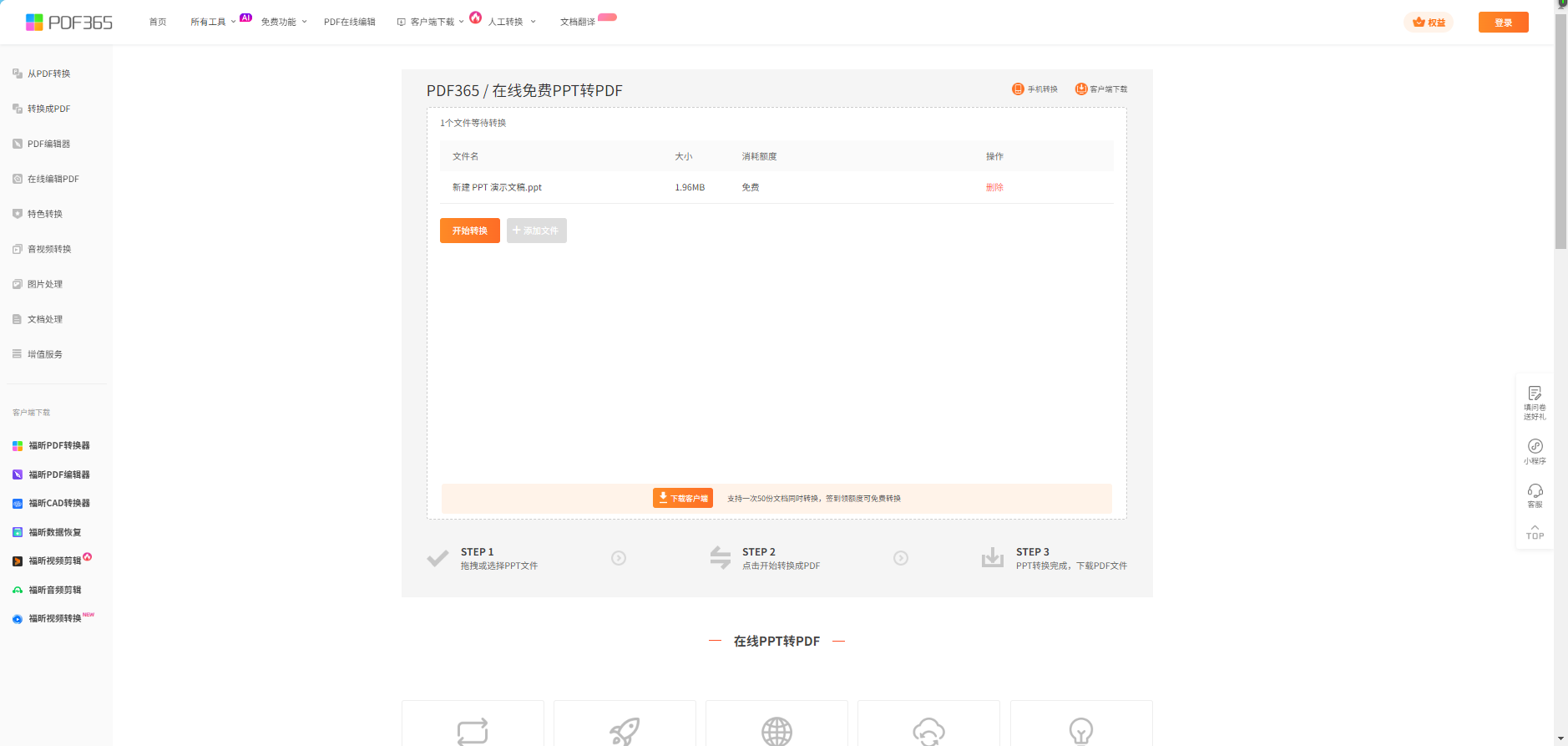 第一步:打开福昕PDF365官网或下载客户端,进入“文档转换”模块,找到“PPT转PDF”功能入口;