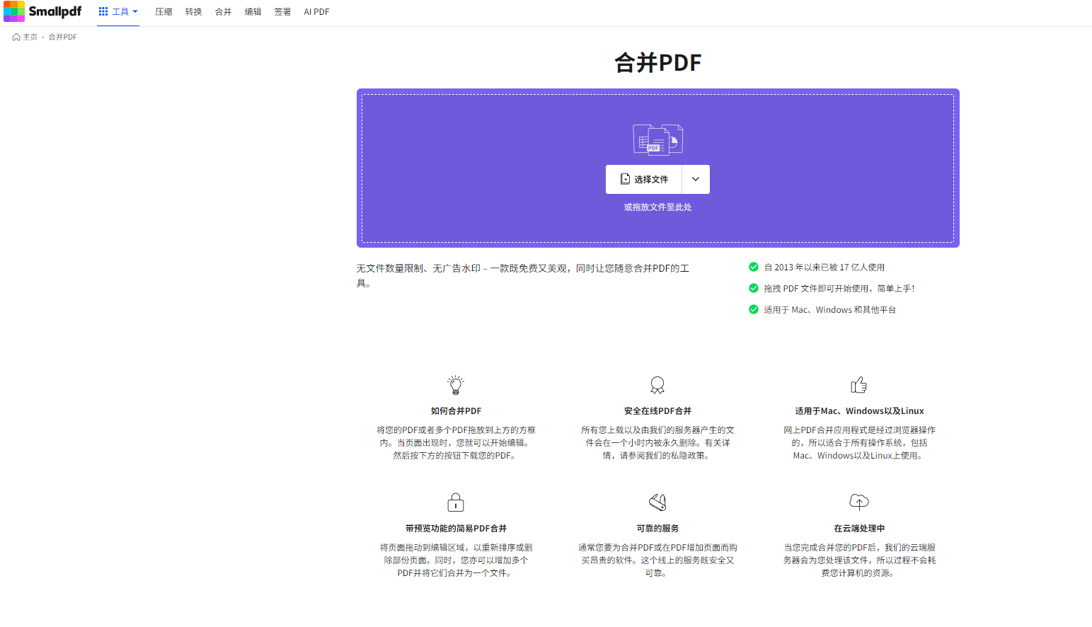 第一步:打开网站点“合并PDF”,把要合并的文件拖进框里,或从设备/云盘选文件。