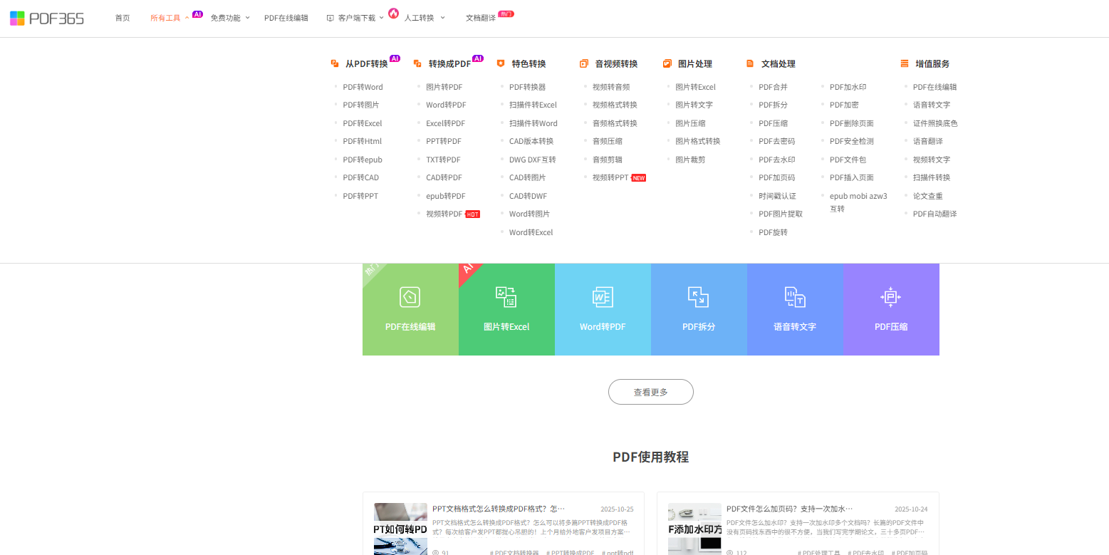 第一步:在浏览器中搜索关键词福昕PDF365找到官网并进入,点击上方的所有功能,找到并点击PDF合并功能选项。