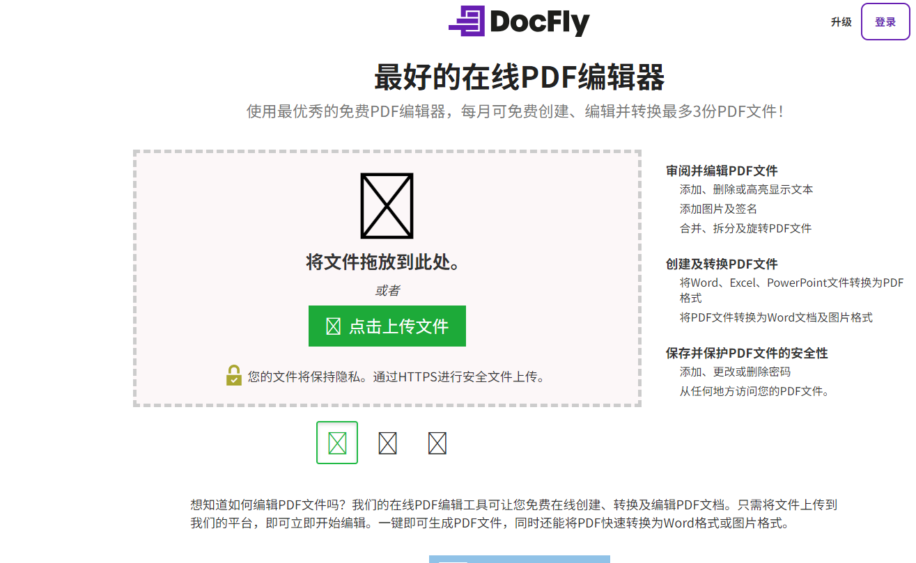 第一步:访问DocFly官网,找到“PDF to PNG/JPG”功能,将需要转换的PDF拖进上传区域;