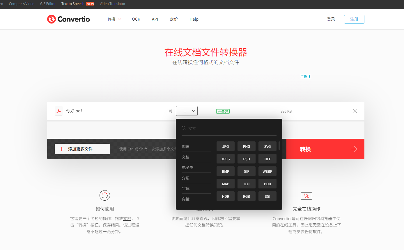第一步:打开Converter官网,点击“选择文件”,上传需要转换的PDF,批量转换可多选;