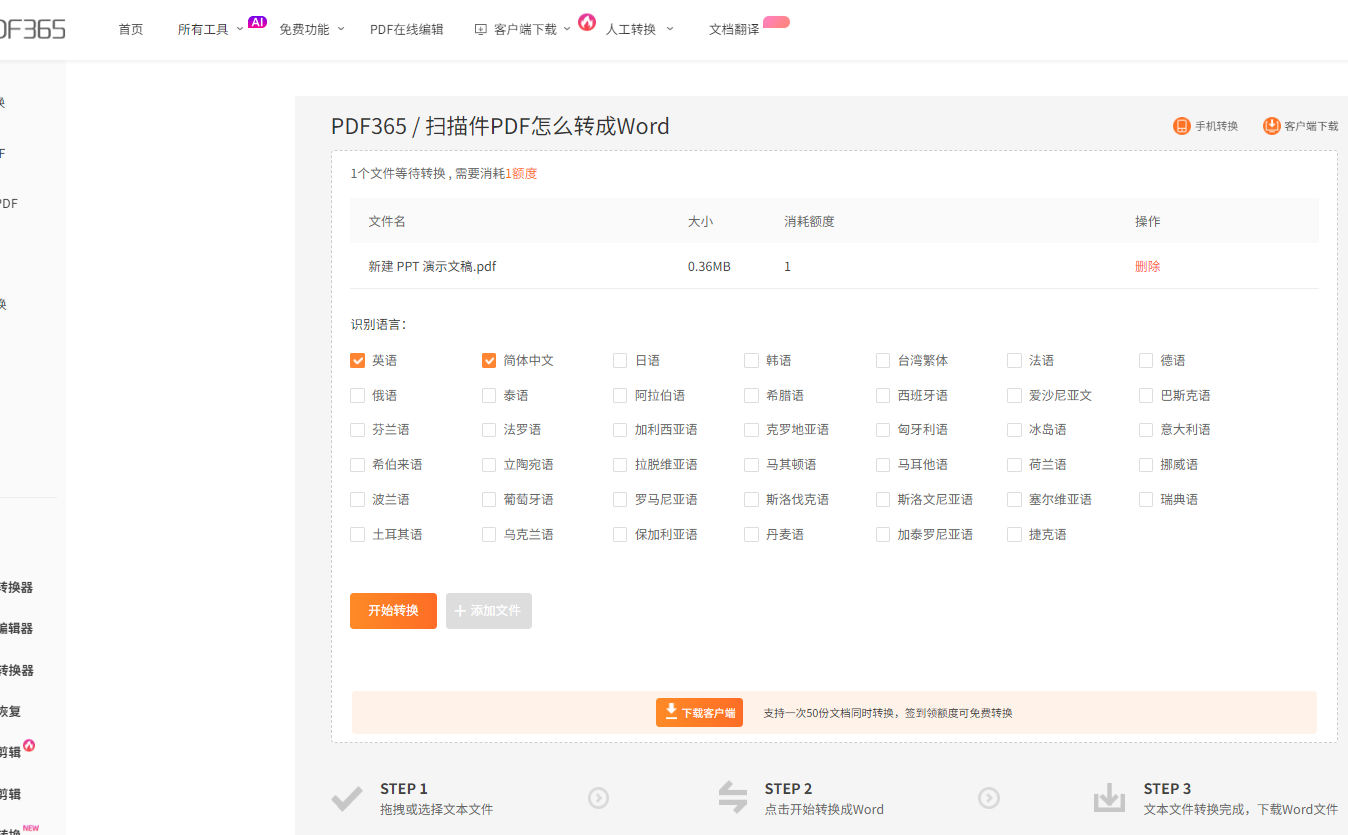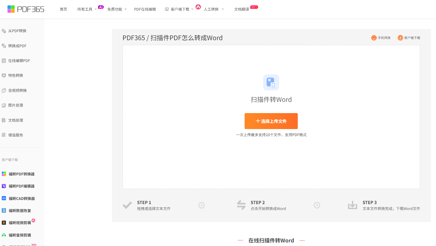 第一步:打开福昕PDF365官网,找到“扫描件转Word”功能,点击“选择文件”上传需要转换的扫描件PDF,支持拖放操作更方便。