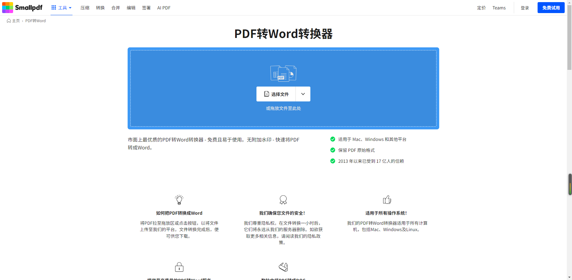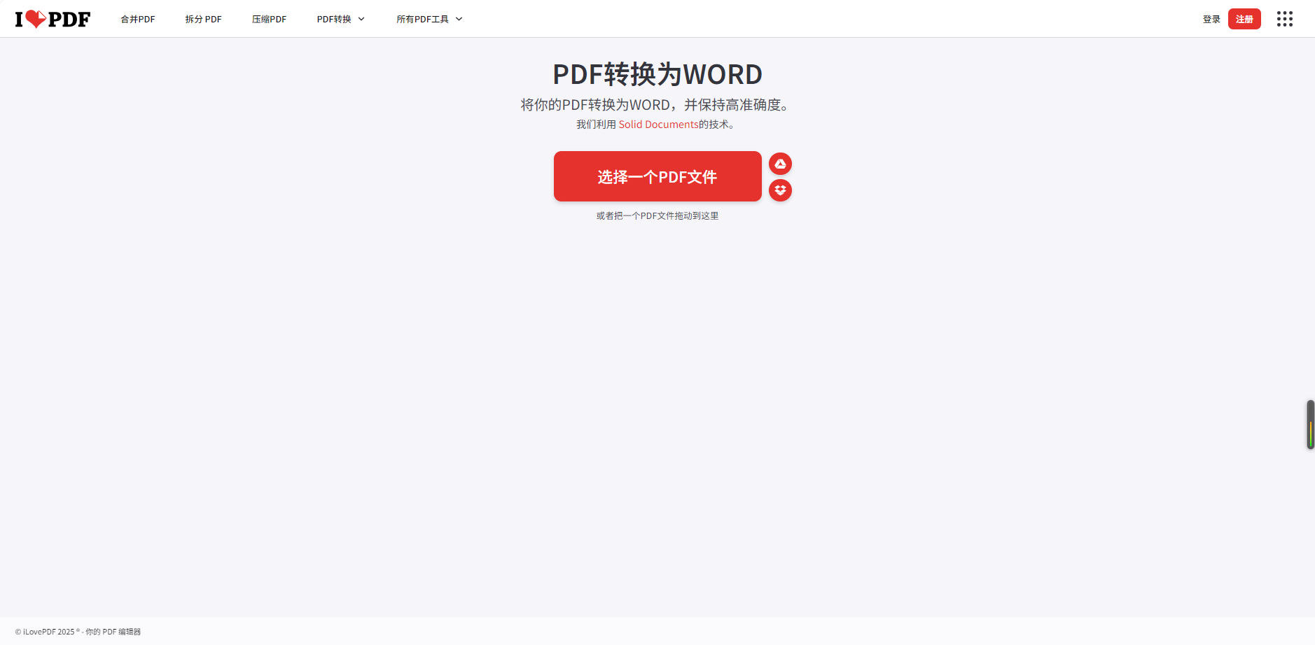 第一步:进入SmallPDF官网,点击“PDF to Word”功能,上传需要转换的扫描件PDF。